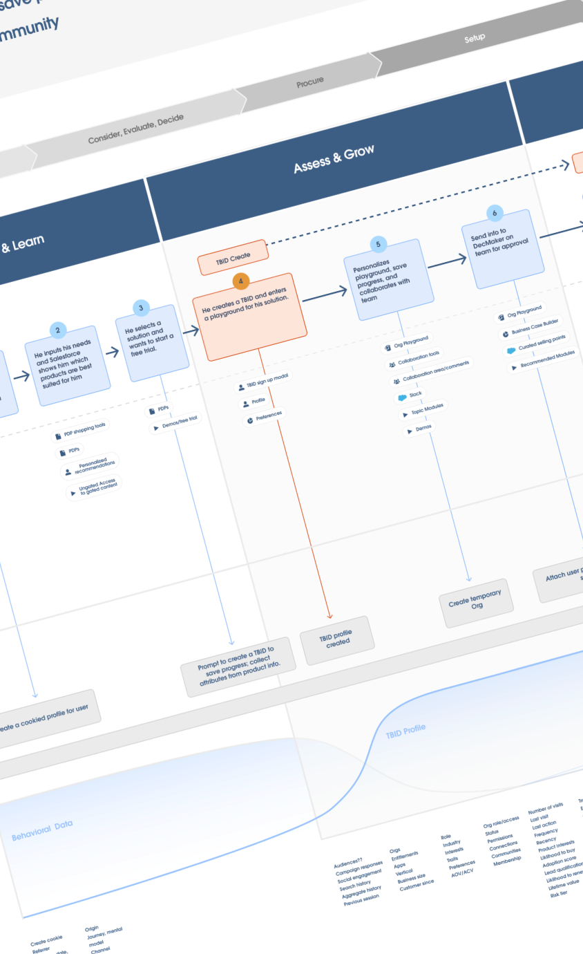 The root challenge extended beyond UX: siloed teams, legacy systems, and the absence of a unified strategy made it difficult to create cohesion. My role became one of strategic facilitation and narrative clarity—aligning stakeholders around a user-first identity vision, connecting product and brand efforts, and laying the foundation for a scalable, personalized experience across the Salesforce platform.