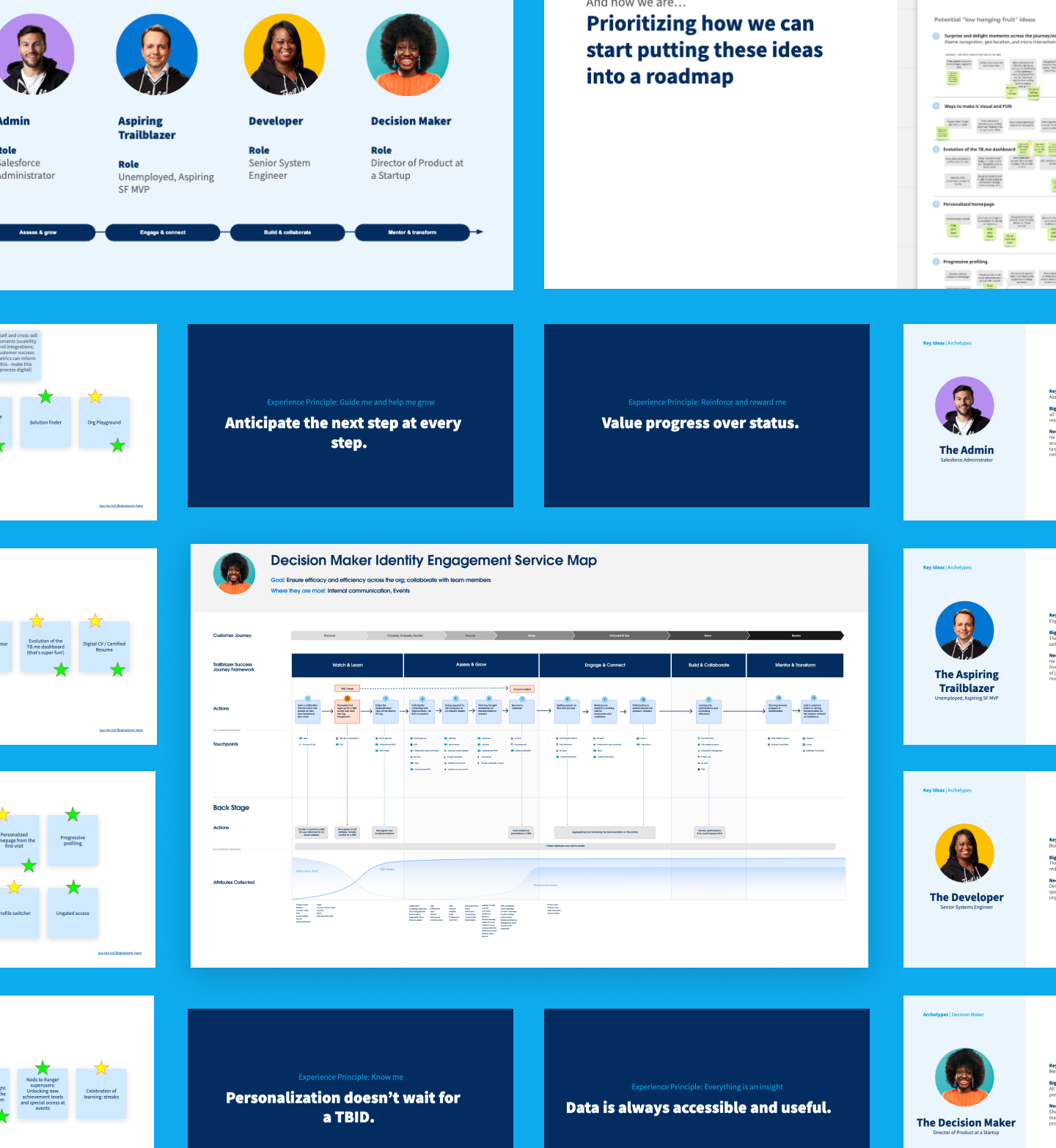 I crafted narrative-driven decks and future-state journey visuals that repositioned identity from a backend function to a strategic, user-facing platform—driving alignment across product and engineering teams. This helped elevate identity as a core enabler of personalization, trust, and engagement across the Salesforce ecosystem.